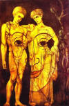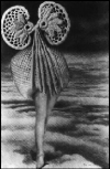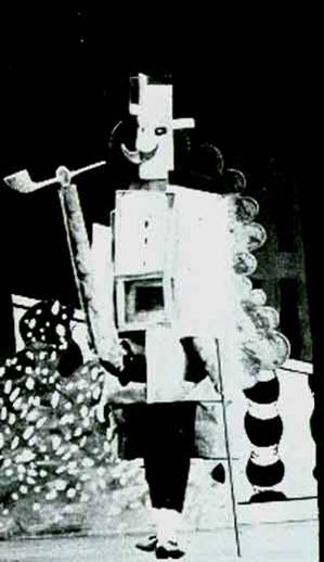 לבשתי תלבושת מיוחדת שתוכננה ביד יאנקו (מרסל ינקו) ובידי. רגלי היו נתונות בגליל הדוק של קרטון כחול ונוצץ שהגיע עד למותני, ועד אותו מקום נראיתי כאובליסק. למעלה לבשתי צווארון ענקי גזור מבריסטול, מצופה אדום מבפנים וזהוב מבחוץ. הוא הודק לצווארי בצורה כזאת שהרמת מרפקי והורדתם הניעה אותו ככנפיים. על כל זאת נוספה מגבעת גבוהה וגלילית של רופא אליל בפסי לבן-וכחול. ...העלו אותי לבמה בחשכה, ואני פתחתי בקצב איטי ובחגיגיות: gadji beri bimba glandridi laula lonni cadori | |