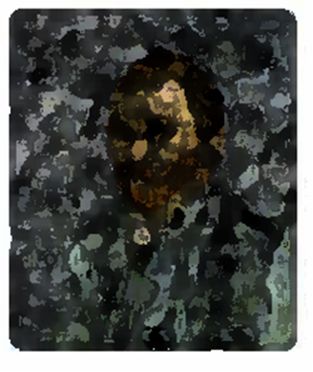 הצבעבשקף מדגיש ומחריף את ריכוז הצבעוניות בפנים, לעומת המעיל והרקע שהם כמעט מונו כרומיים. הצללים הכהים הם תוספת של גוון ירקרק בתוך החום של הפנים. האדום משקף את השיער החום אדמדם היוצר מעין מסגרת, לפנים והצהוב את האזורים המוארים |