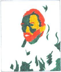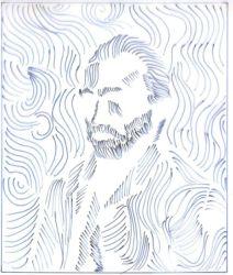 הדיוקן הסוער, מתמזג ברקע. עיצוב הפנים המרוכז מתבלט בצבעוניות קווי הזקן והשיער בצבעי חום-אדמדם, היוצרים מסגרת לפנים. הבעה של עצב עמוק נשקפת מהעיניים ומזווית הפה. הטון הכללי של התמונה כחול אפור, כנתון במערבולת המשותפת למעיל ולרקע שהדמות כאילו מתמזגת בו. הבדלה בין המעיל לרקע נעשתה בגוון הכהה במעט של המעיל ובקווי מתאר לא רצופים בכחול כהה המעצבים את מסגרת הדמות.